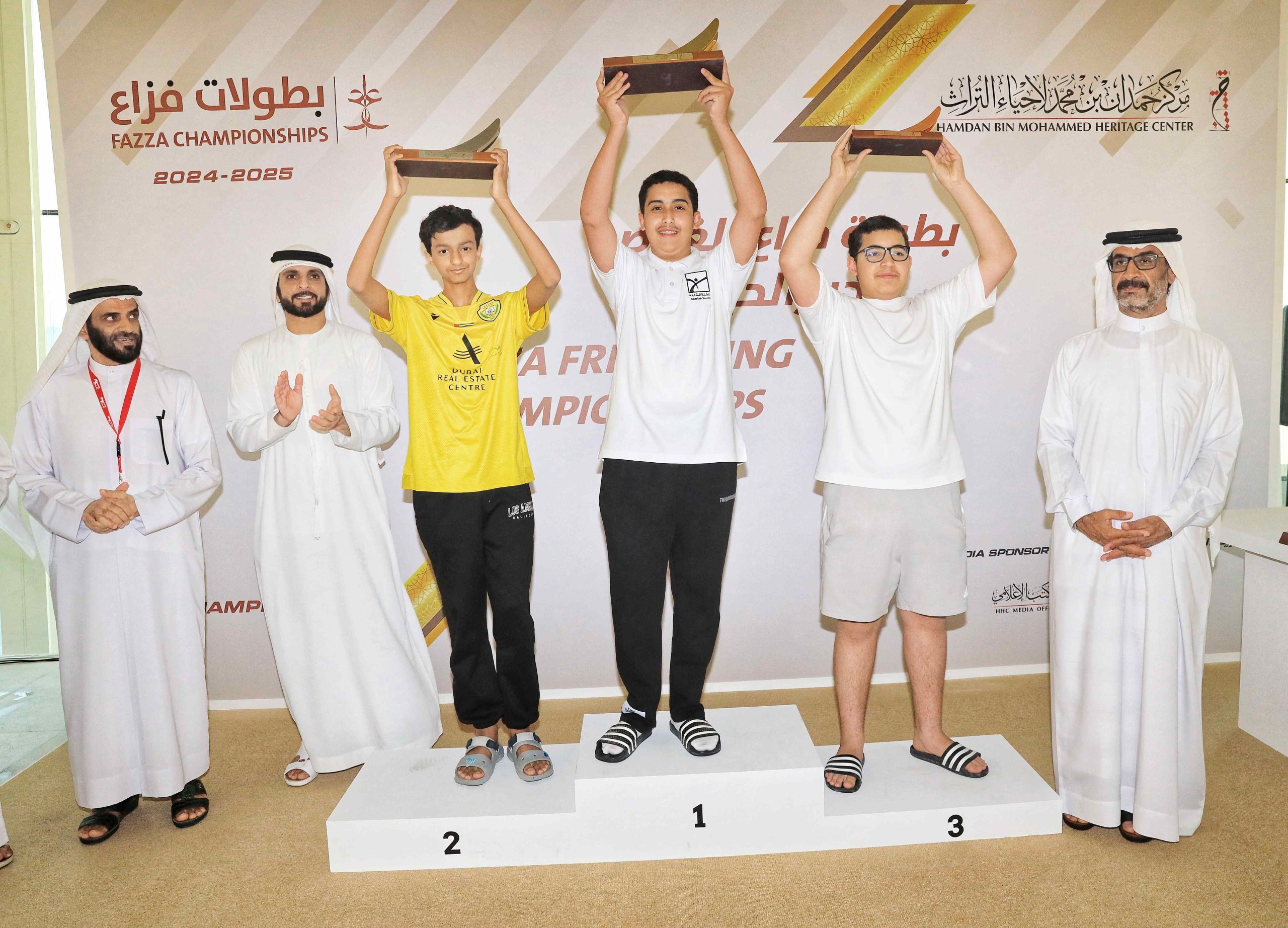 توّج الفائزين سعادة عبد الله حمدان بن دلموك، الرئيس التنفيذي لمركز حمدان بن محمد لإحياء التراث، بحضور راشد حارب الخاصوني، مدير إدارة بطولات فزاع، ونتالي جوزيف أواديسيان مدير إدارة الإذاعات، ومدير الإعلام والاتصال المؤسسي في المركز.